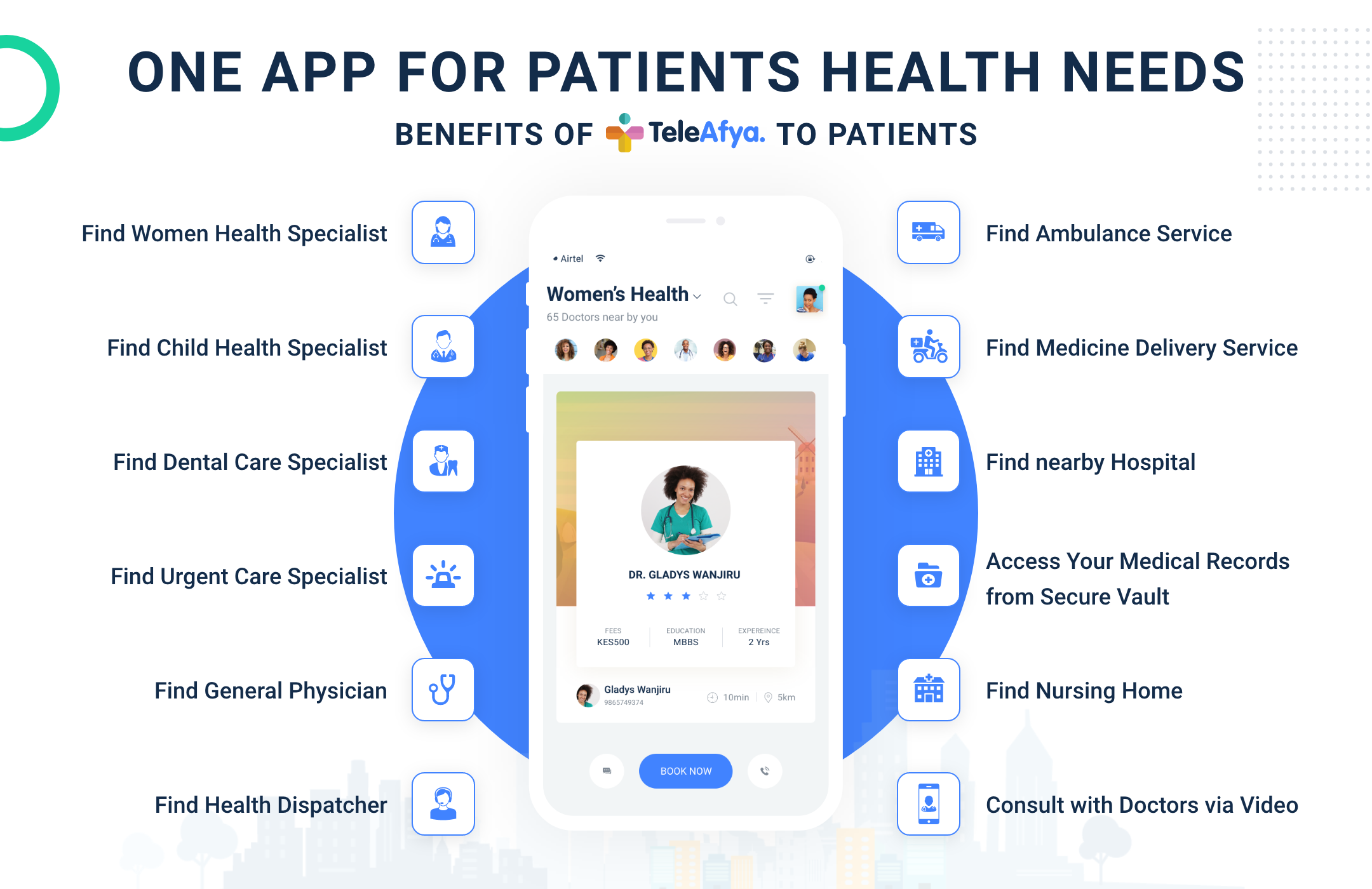 Through the app, patients will be able to connect to doctors for medical assistance. Patients with smartphones are able to reach out to doctors on the app via text, video calling or messaging. Patients without smartphones are able to benefit by visiting local TeleAfya Dispatch Centres who will match them with medical professionals available.