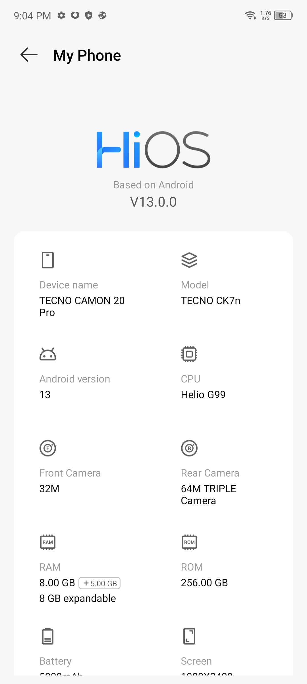 Operating system: Android 13, HIOS 13