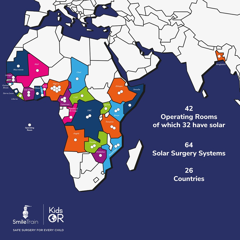 Smile Train has embarked on an initiative to install solar power in pediatric operating theatres in the African continent. This initiative is in collaboration with Scottish charity Kids Operating Room (KidsOR).