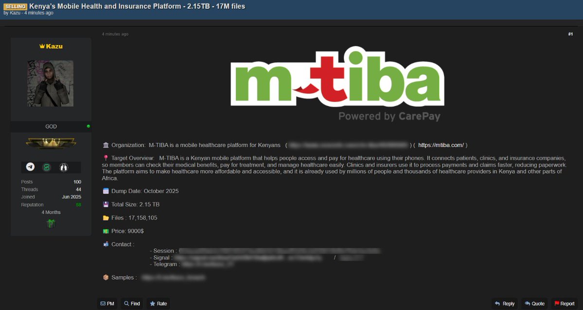 A threat actor, identified as “Kazu,” is advertising the stolen database, allegedly a staggering 2.15-terabyte file, on the cybercrime forum darkforums[.]st, raising urgent security alarms across Kenya’s health-tech sector. The breach was first reported Twitter user @_mailler, who posted screenshots from the forum.