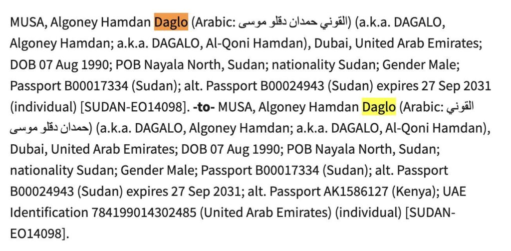 While Algoney manages the finances, OFAC also leveled sanctions against three field commanders for what U.S. officials described as a “horrific campaign of terror” in Darfur. These individuals are now blocked from the U.S. financial system under Executive Order 14098: