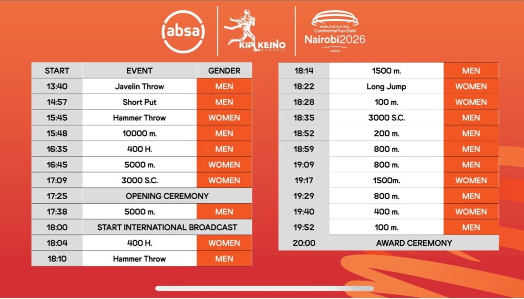 Athletics Kenya Meet Director Barnabas Korir confirmed that entry to the stadium will be free of charge, urging Kenyans to turn out in large numbers. “We are all set,” Korir stated. “The event will conclude with the men’s 100m race followed by the closing ceremony at 8:00 PM. We expect a massive turnout both at the stadium and from global audiences tuning in to see the magic of night-time athletics in Nairobi.”